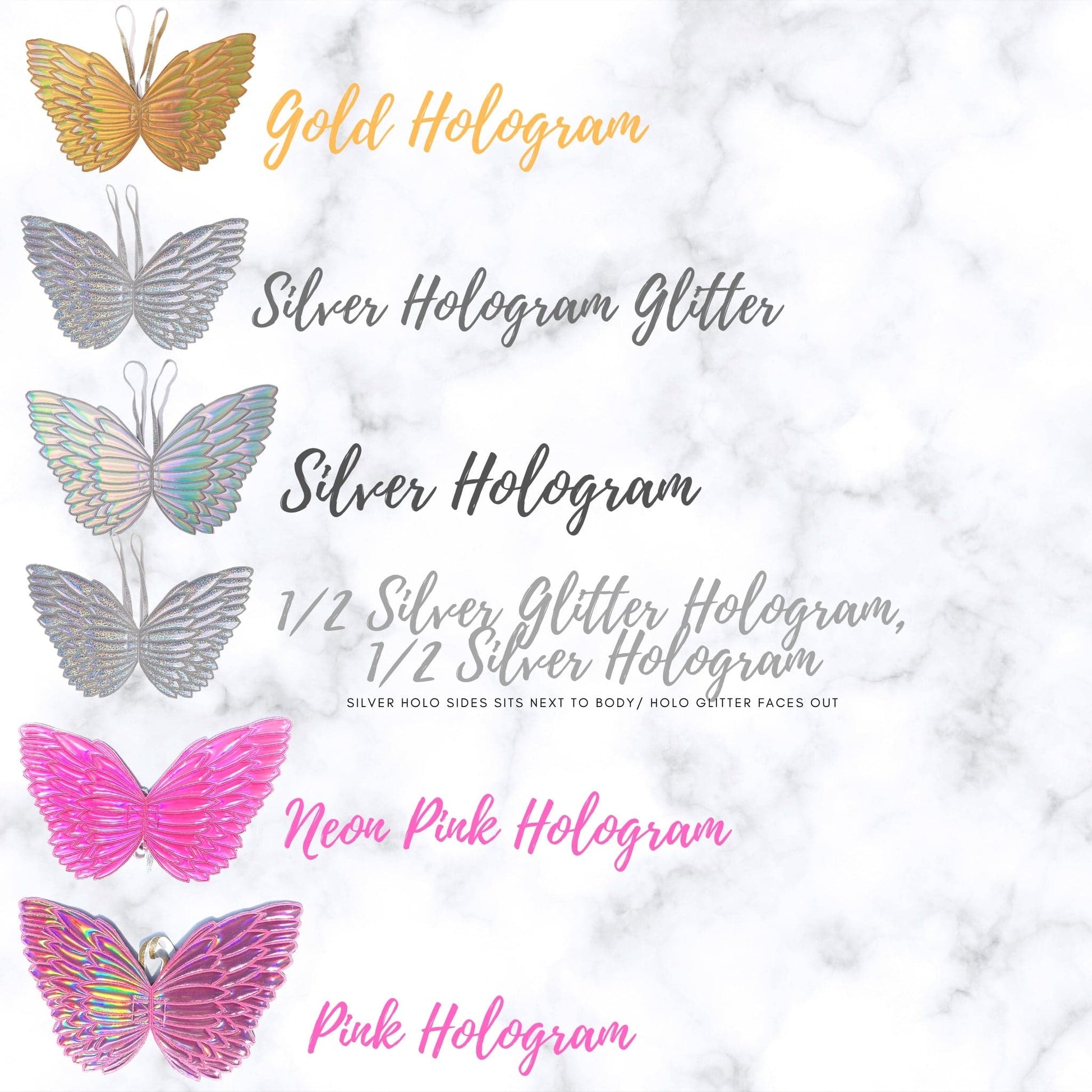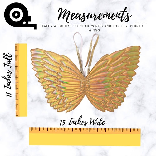 Each pair of our high quality iridescent fairy wings are made from a holographic pu canvas, foam, polyester thread and foam. The layers of the fairy wings construction provide integrity and create fairy wings that will last a long time. Our fairy wings are easy to clean, the slick pu surface provides a way to wipe away any spills.